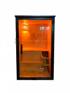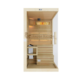 Это специально оборудованная готовая деревянная кабина для сухого и влажного парения. Электропечь нагревает пространство внутри и позволяет сбрызгивать камни водой, слегка увлажняя воздух. Такая процедура позволяет избежать перегрева. Каркас сауны выполнен из массива кедра, снаружи и внутри обшит липовой вагонкой сорта «Экстра» и имеет теплоизоляционный слой. Также двухуровневый полок идёт из кедра для обогащения внутри кабины полезными фитонцидами, а в сочетании с противовирусными свойствами липы сауна становится настоящим источником здоровья.